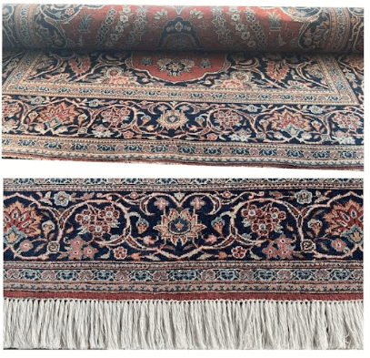 Alte und sehr feine Persischer Ghom Seide. Extrem dicht über 1 Millionen knoten pro qm geknüpft. Fransen und Teppich waren beschädigt und jetzt sieht es wieder wie neu aus.